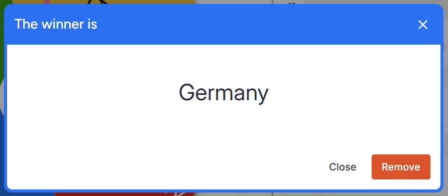 - Close: The winning entry (“Germany” in this case) remains on the wheel for future spins.